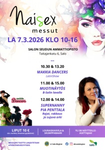 MESSUJEN TUOTTO LAHJOITETAAN HYVÄNTEKEVÄISYYTEEN. @lcsalobirgitat 12.00 & 14.00 SUPERNANNY PIA PENTTALA Rajat, rakkaus ja sujuva arki LA 7.3.2026 KLO 10-16 10.30 & 13.20 MAKKIA DANCERS LatinShow 11.00 & 15.00 MUOTINÄYTÖS B-Salin lavalla SALON SEUDUN AMMATTIOPISTO Taitajankatu 6, Salo LIPUT 10 € (sis. narikka, ilmainen pysäköinti) LOUNASKAHVILA & SKUMPPABAARI YLI 80 NÄYTTEILLEASETTAJAA! LC Salo Birgitat